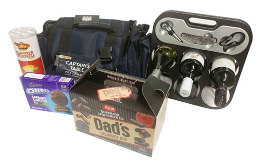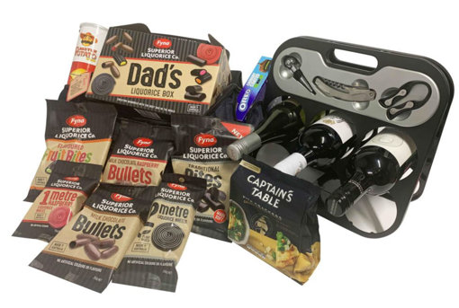 A Fyna Foods Superior Liquorice Box containing: Traditional Black Liquorice bites, flavoured liquorice fruit bites, milk chocolate raspberry bullets, 1 metre long raspberry wheel, milk chocolate bullets and a 2 metre long black liquorice wheel - valued at $18.95